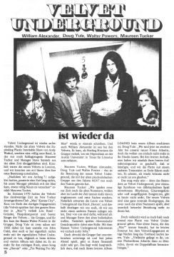 Maureen Tucker: "Wir spielen zwar zur Zeit noch die alten Nummern, wollen aber im Laufe der Zeit immer mehr davon wegkommen und neue Sachen machen. Natürlich erwarten die Leute von Velvet Underground das Stück ,Heroin', und deshalb überlegen wir uns auch, ob wir uns nicht einen anderen Namen zulegen sollen. Drei von uns sind dafür, während ich und Manager Steve den alten beibehalten wollen. Natürlich spielen ökonomische Gesichtspunkte dabei eine Rolle: Mit dem Namen Velvet Underground bekommen wir einfach mehr Jobs."